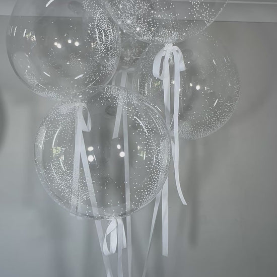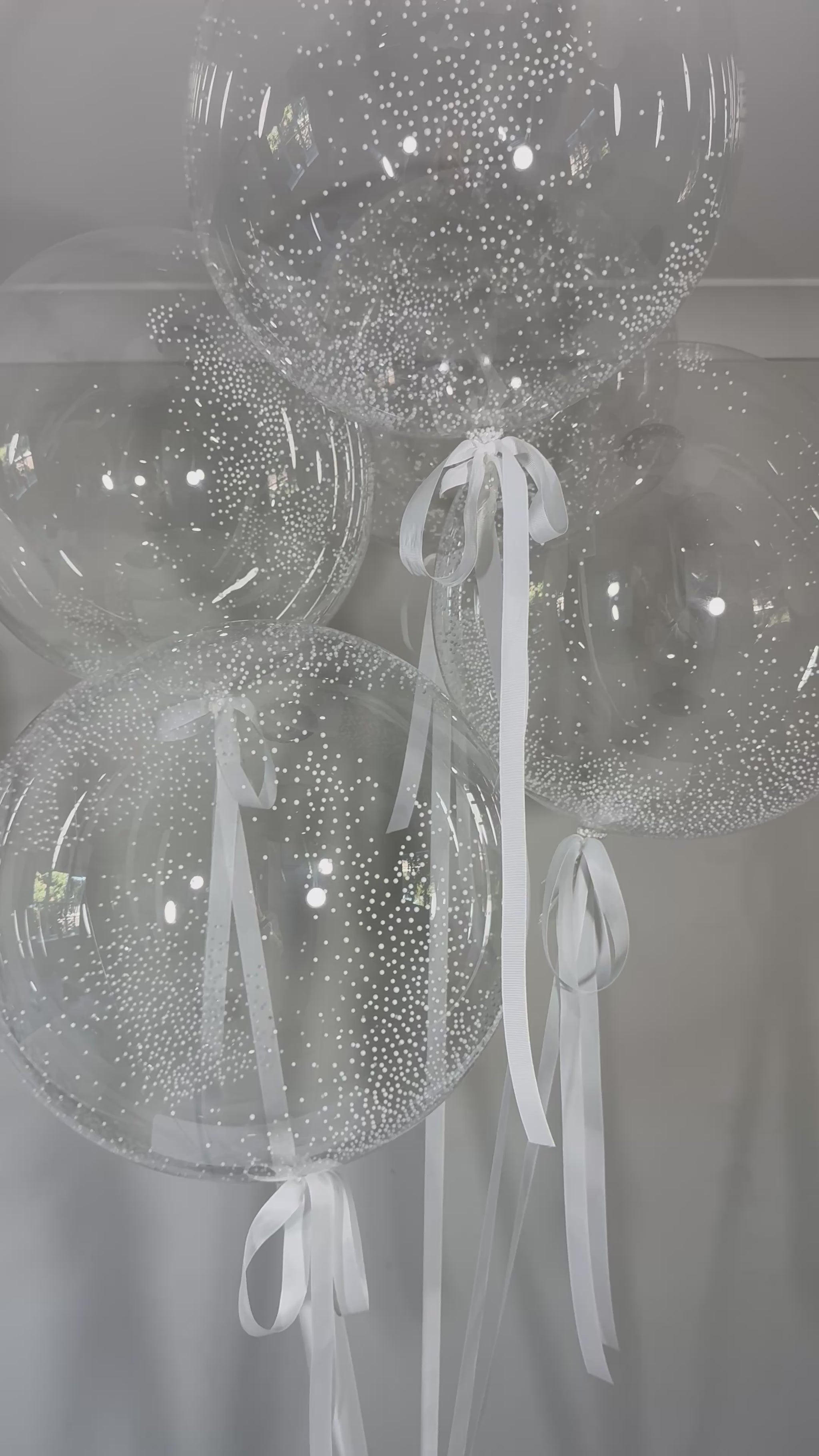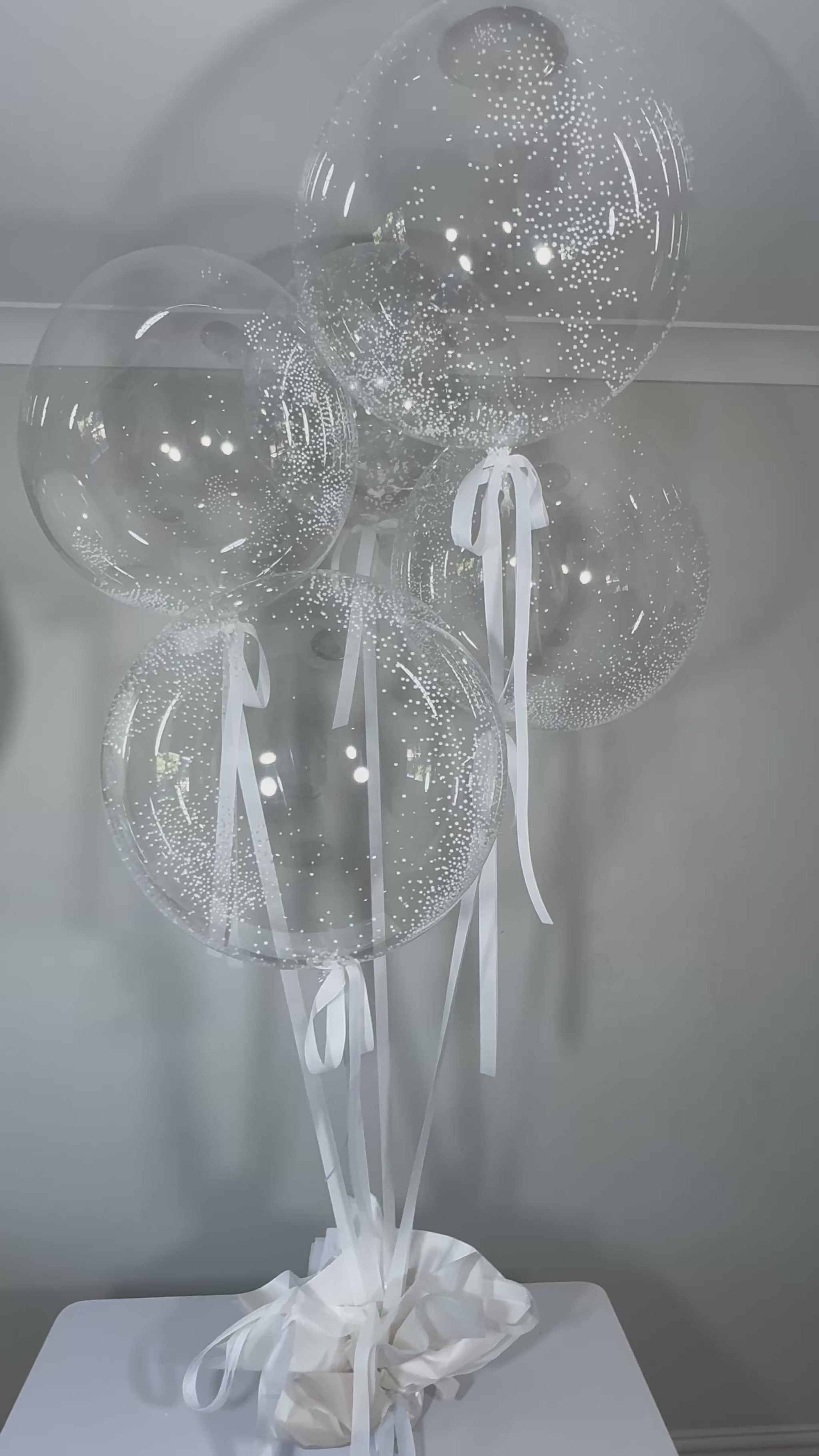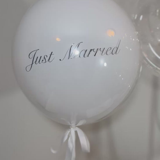 Celebrate love in style with our elegant bridal balloon display. Six crystal-clear balloons filled with delicate pearl foam beads are paired with a luxurious double-layered white balloon, personalised with Just Married lettering. Chic, timeless, and the perfect finishing touch for a wedding celebration.