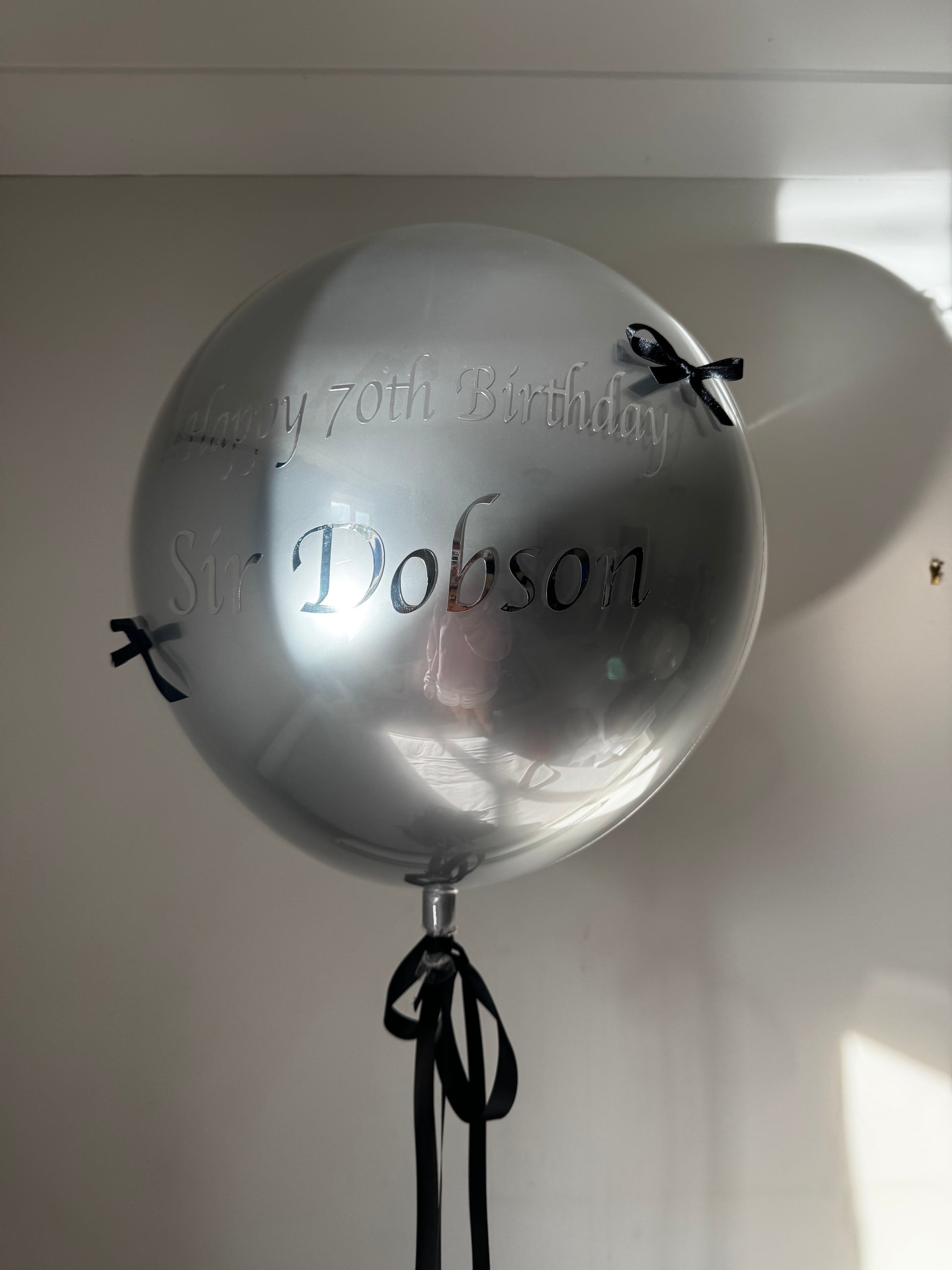 This Imperial Silver Signature piece features a mirror-silver finish with black personalisation and hand-tied satin bows for a sleek, masculine look.