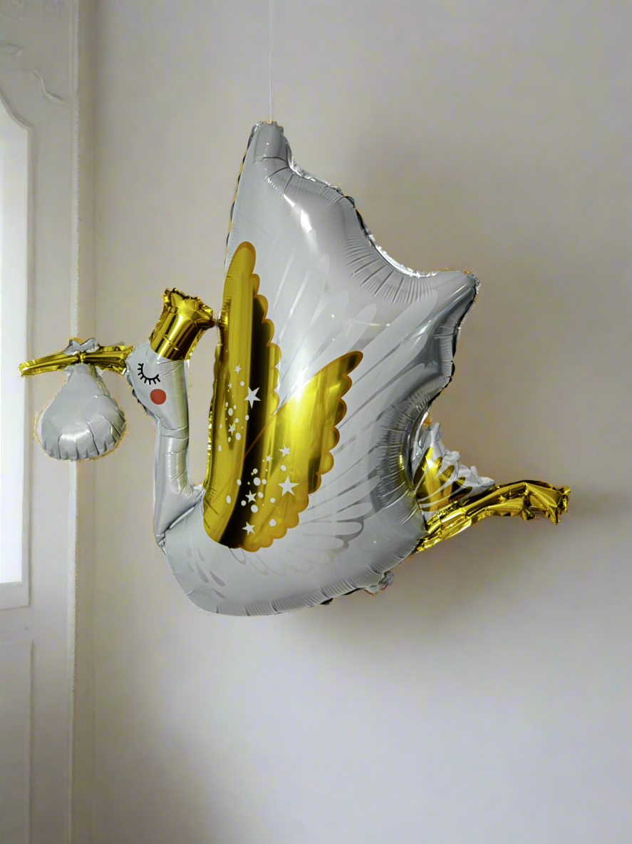 Celebrate a new arrival with our charming Stork Balloon, featuring a beautiful silver and gold design with a sweet sleeping baby detail.