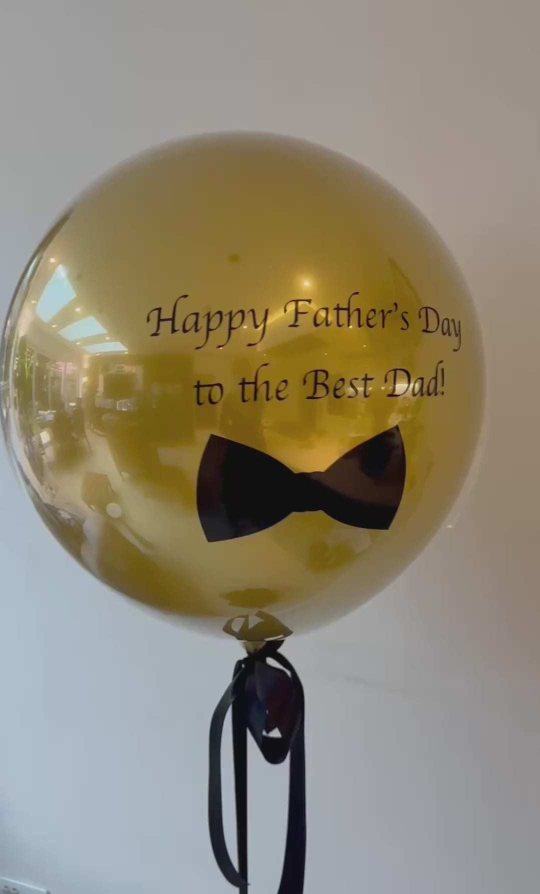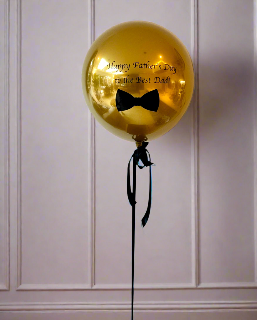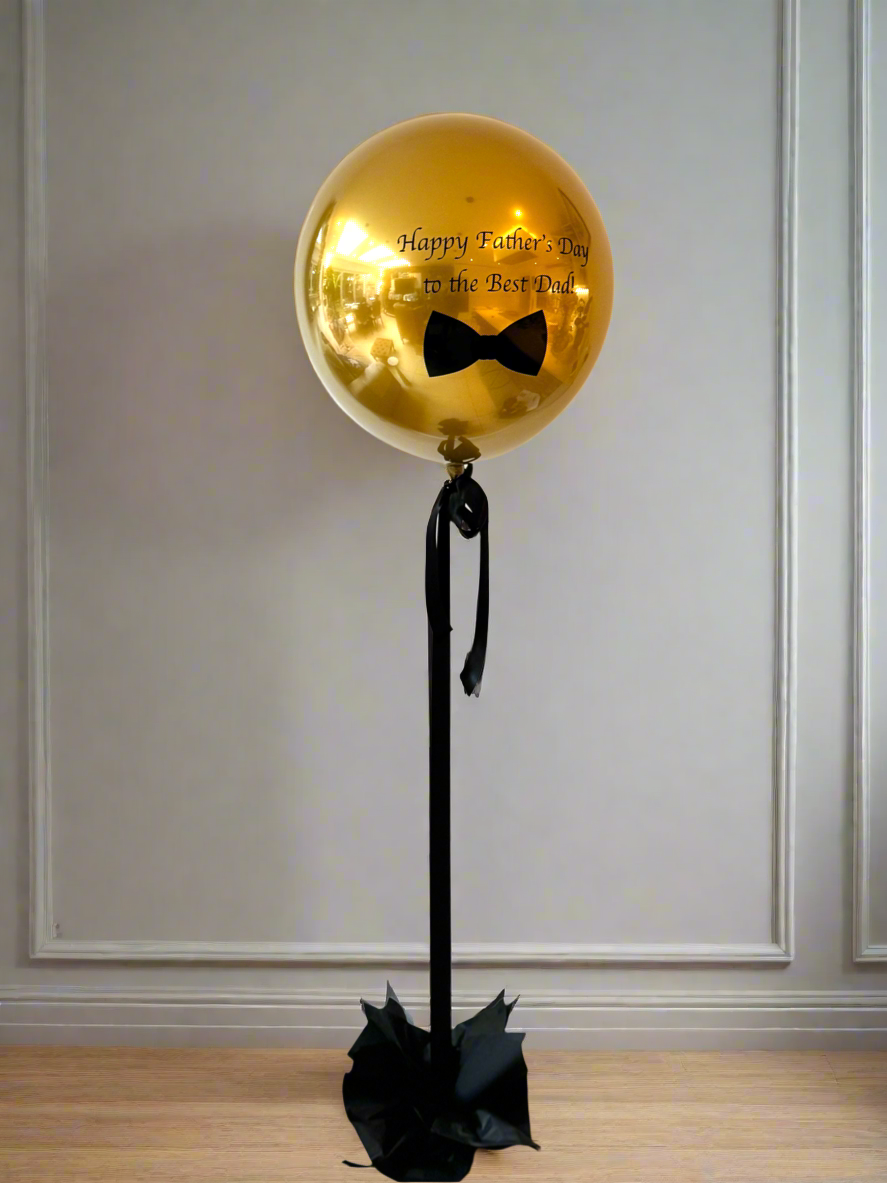 This gold balloon is double-layered and finished with a miniature black bowtie — a smart and thoughtful choice for birthdays, Father’s Day, or simply to celebrate someone with classic style. Personalised with your message in bold black lettering.
