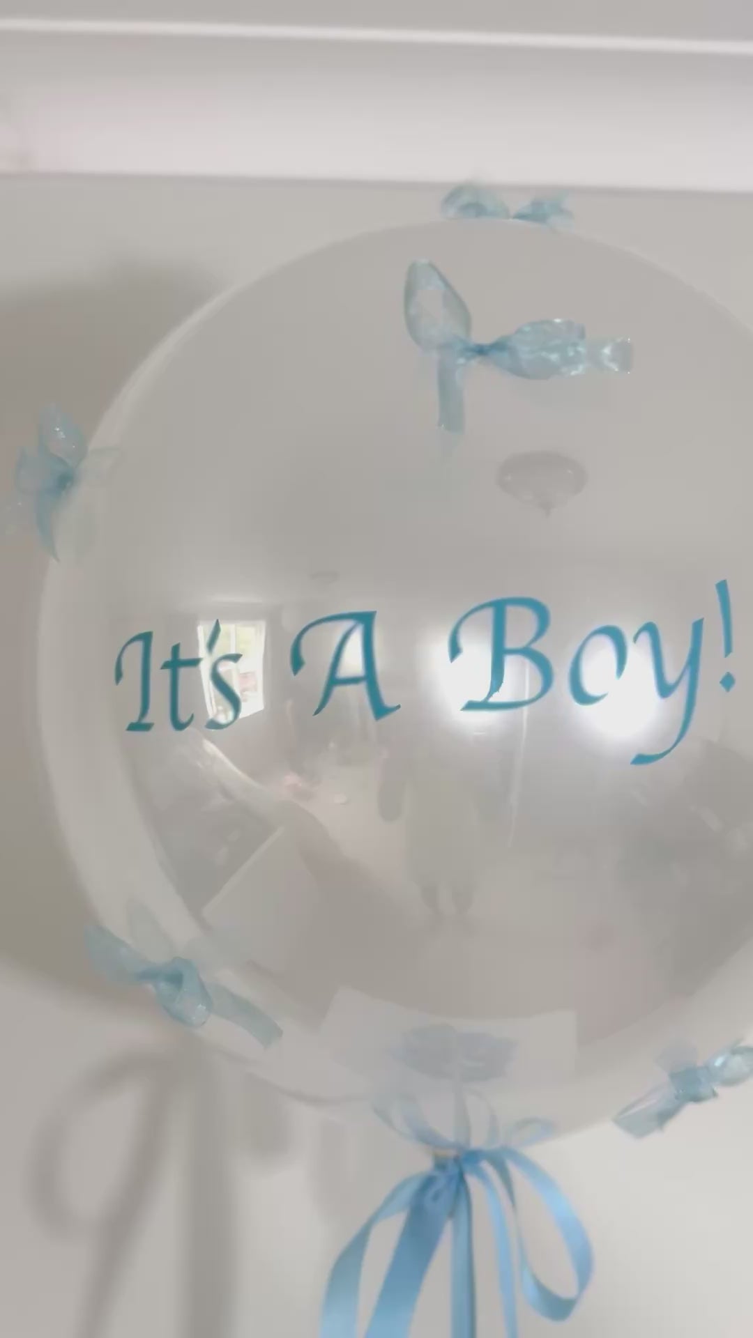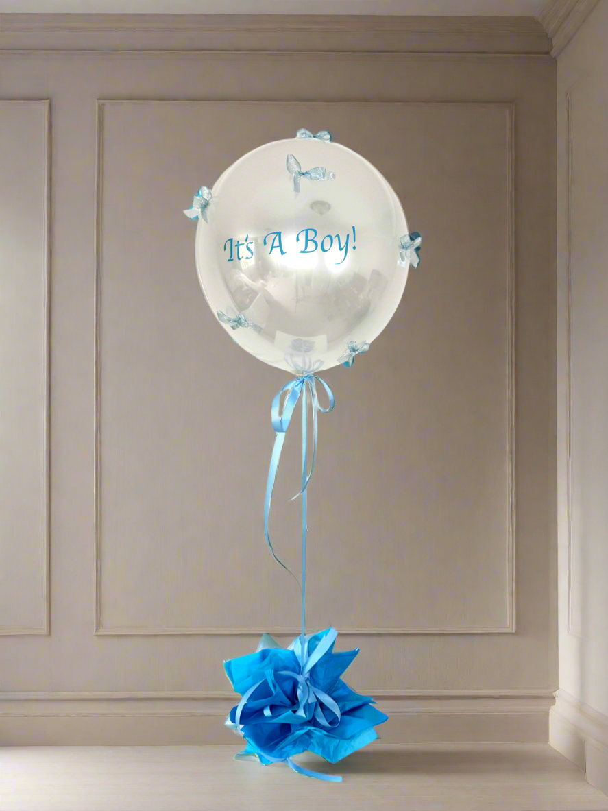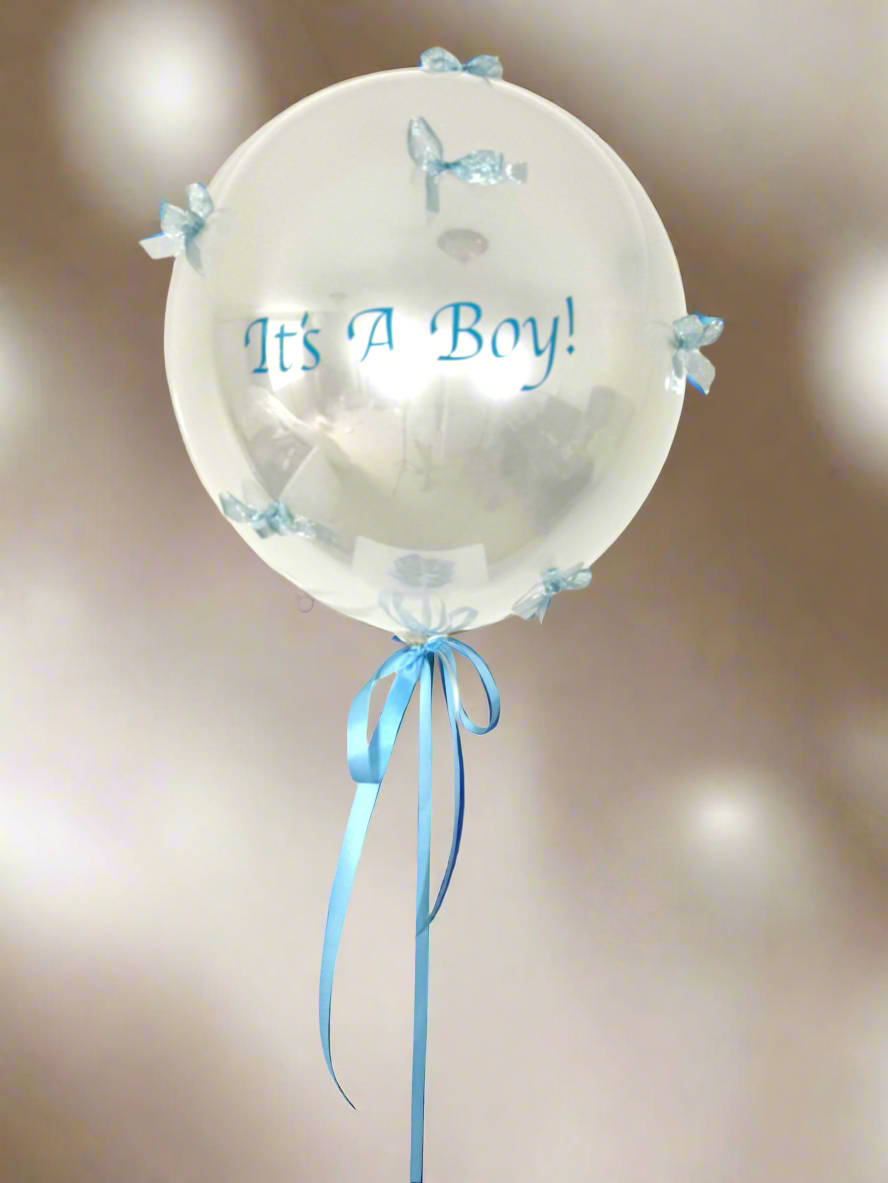 This pearly white, double-layered balloon is covered with delicate blue ribbons and personalised with the message It’s A Boy! in soft blue lettering — a charming surprise for new parents or baby celebrations.